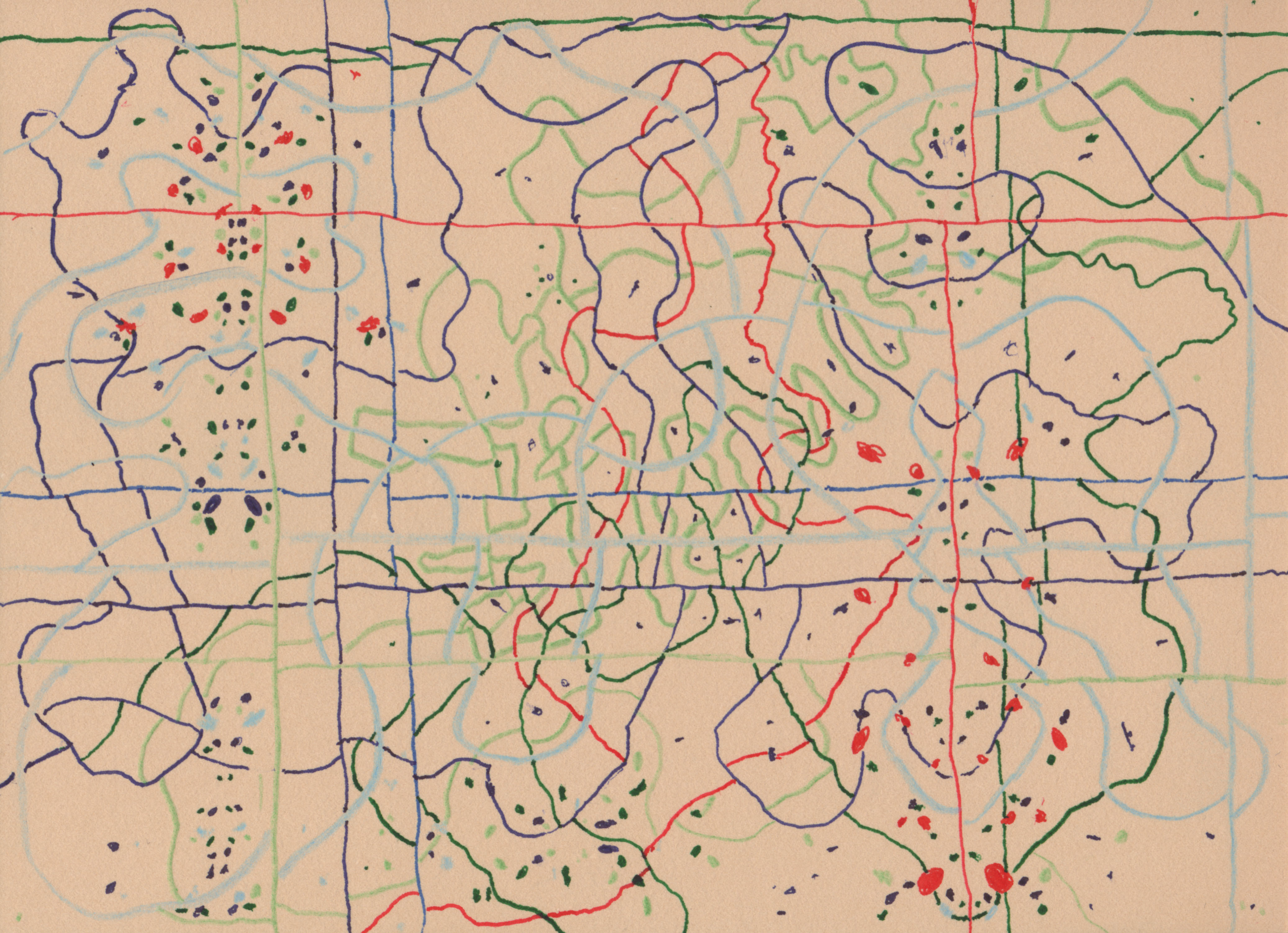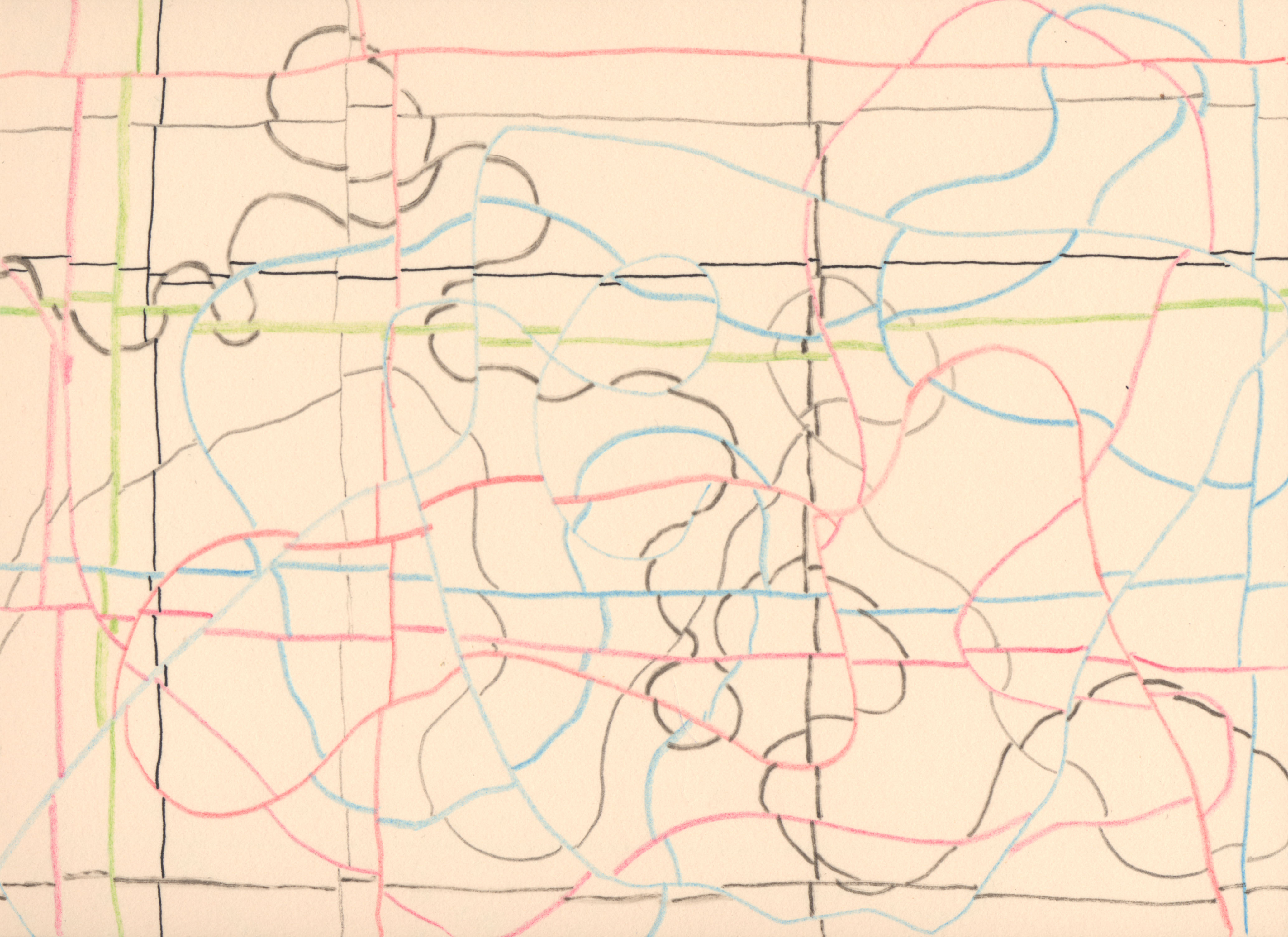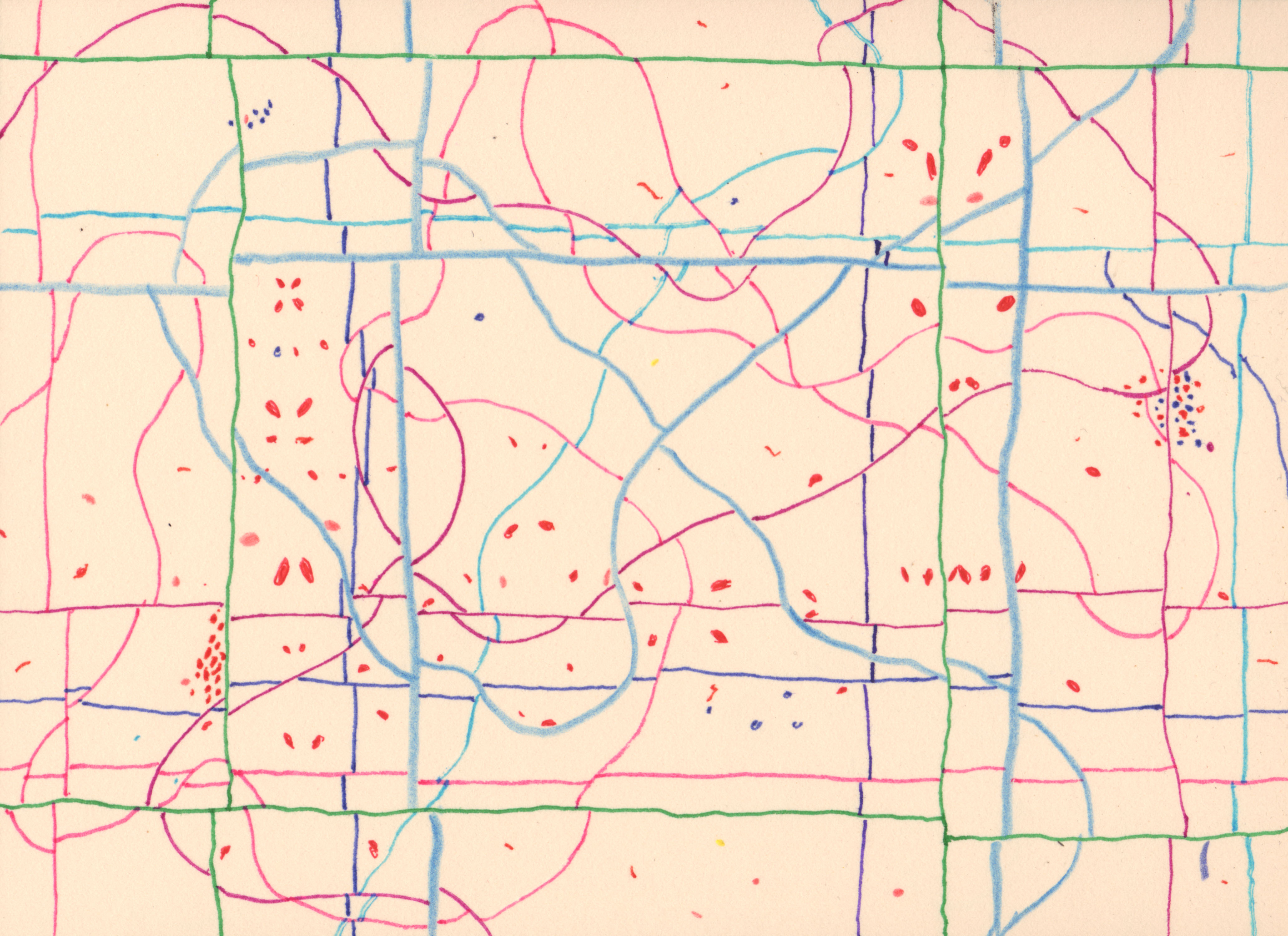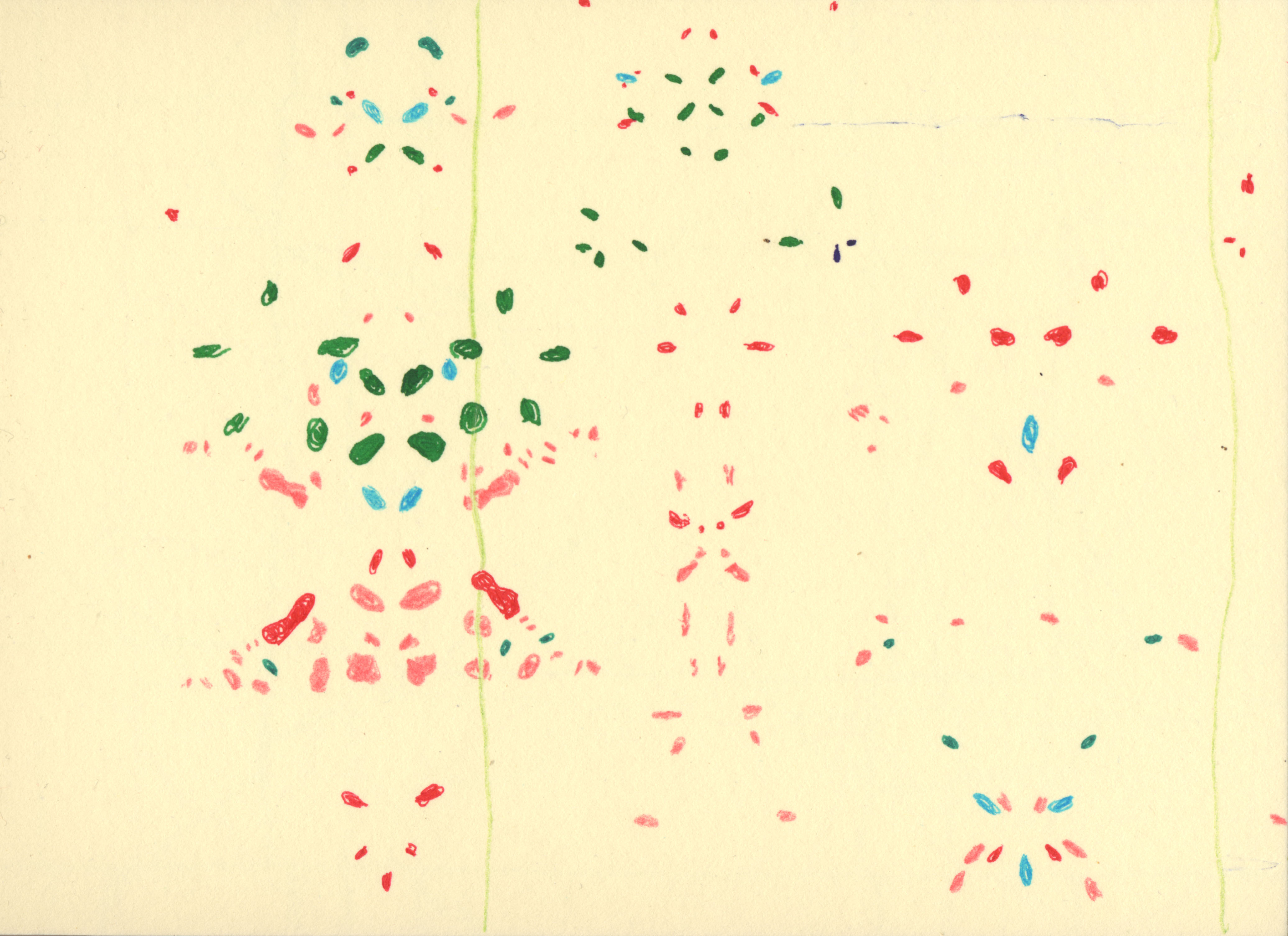 ink, colored pencil, acrylic, watercolor and guoache on paper